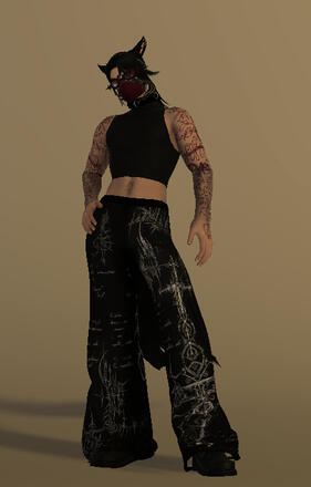 build. slender and lithe.height. somewhere just shy of five fulms.eyes. near-black. pupils disappear into his irises.unique features thick scar under each pectoral. alchemical-esque tattoos spanning the length of his arms and back. twin-tail, splitting halfway down its length into two tips.hair black with grey-white streaks.family. adoptive mother, many 'siblings'.vices. tends to hide and observe rather than saying hello. lightweight. well-hidden streak of arson.aether?. competent- versed in conjury. nauseated with teleportation but not incapacitated.